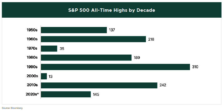 As of this writing, the S&P 500 is sitting at a record high. In situations like this, investors may face what are often called “psychological barriers to entry.” They may question whether it’s the best time to put new money into the market. This type of thinking is tied to attempts to time the market—where investors try to avoid buying at market highs and wait for market lows. However, timing the market is almost impossible to get right. And all-time highs are not uncommon—so you would be missing out on a lot of opportunity if you tried to avoid them. In fact, since 1950 the broad U.S. equity market has set more than 1,250 all-time highs on its way to the current level, averaging more than 16 new highs each year.