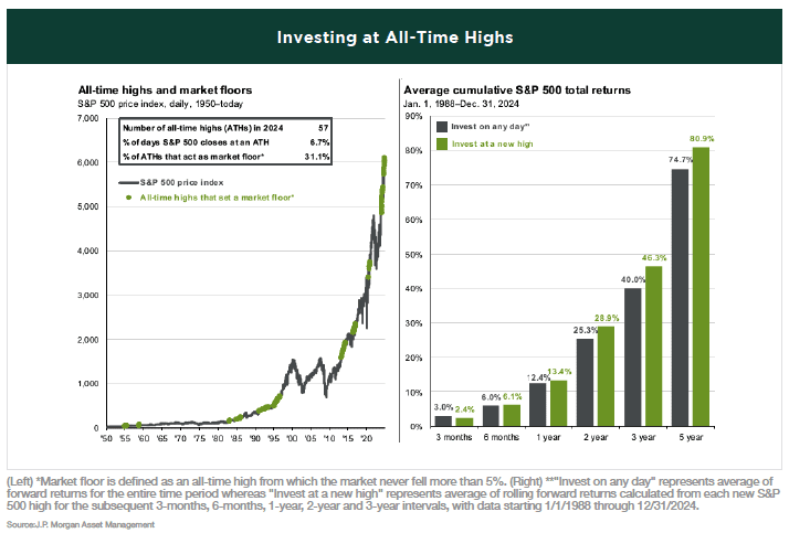 For many investors, market pullbacks feel almost inevitable when markets reach all-time highs. This sentiment is particularly strong in today’s environment, where a significant portion of the S&P 500’s return has been driven by concentrated gains and multiple expansion. However, stocks can remain attractive even at all-time highs. Since 1950, the S&P 500 has reached an all-time high on about 7% of trading days, and nearly a third of these highs became new market “floors”—levels from which investors never had the chance for a “second bite of the apple.”