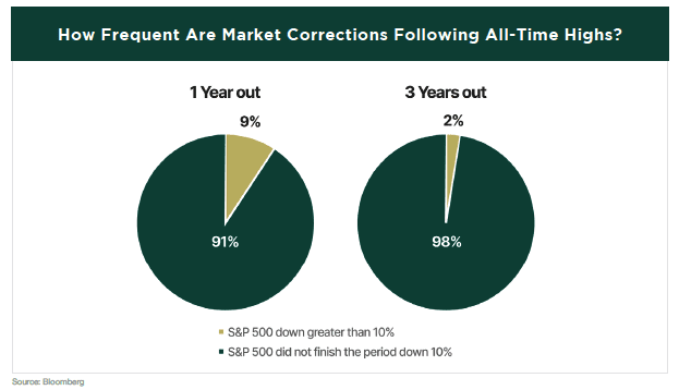 Some investors choose to stay in cash, waiting for a significant correction before they invest. However, often a major correction never materializes, leaving the investor with the regret of missing out on potential returns. In fact, since 1950, when we look where the S&P 500 was trading one year after hitting each all-time high, only 9% of the time has there been a correction greater than 10%. When we extend the time horizon, market corrections become even rarer. At the end of a three-year period following an all-time high, the market was down by more than 10% only 2% of the time.