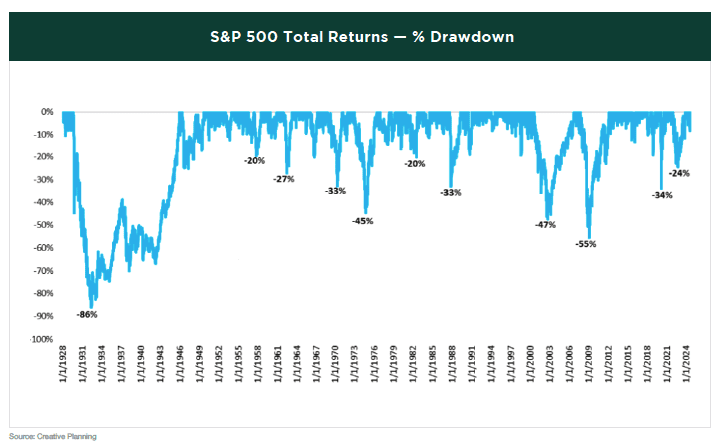 What’s the catch? It wasn’t a smooth, straight line higher—far from it. An investor in U.S. equities would have been in a drawdown over 90% of the time.