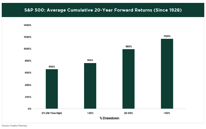 The following chart illustrates the average cumulative 20-year forward return of the S&P 500 at various levels of market drawdowns. For example, when the market is at an all-time high, the average cumulative return 20 years later is 658%. In contrast, when the market is down more than 20%, the average cumulative return 20 years later rises to 993%.