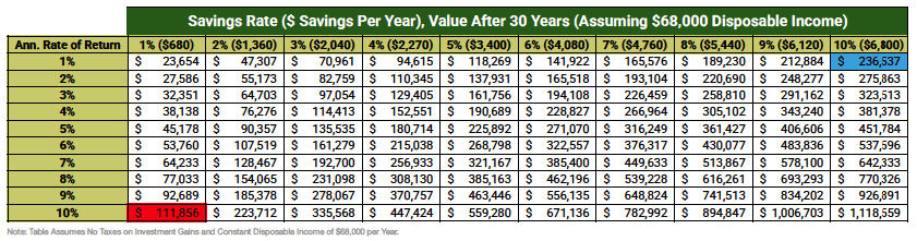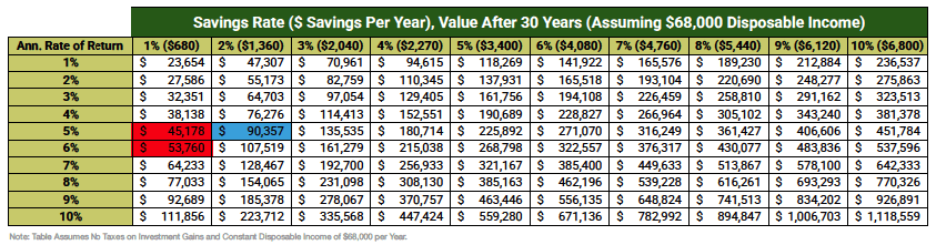 For instance, if a household with a disposable income of $68,000 saved only 1% per year and earned a 5% return, after 30 years they would have $45,178. If they earned a 6% return instead, that amount would rise to $53,760—a 19% increase.