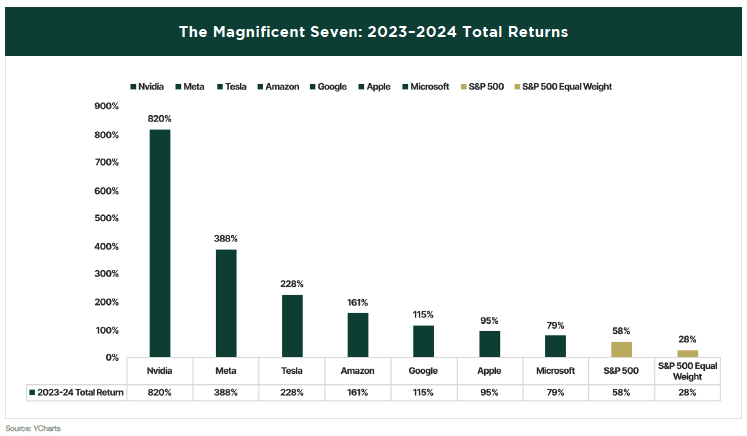 Although a broadening of the stock market rally was a theme for parts of the year, the “Magnificent Seven”—the largest stocks by market capitalization—continued to shine with another exceptional year of performance. Over the past two years, these seven companies have significantly outpaced the majority of other S&P 500 constituents.