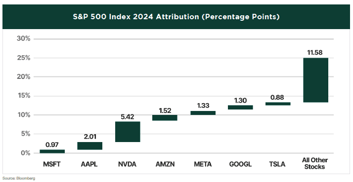 While the stock market had an impressive year, with the S&P 500 delivering a total return of 25%, it’s significant to note that the “Magnificent Seven” stocks contributed 53.7% of that return, reflecting the historic level of concentration currently seen in the market.