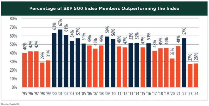 This doesn’t mean the other 493 stocks in the index performed poorly—many actually delivered strong results. However, most S&P 500 constituents underperformed the index for the second year in a row, making this the narrowest market we’ve experienced since the late 1990s.