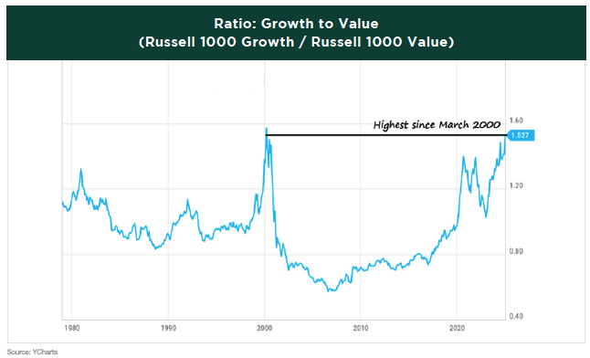 Growth stocks outperformed value stocks by 19% in 2024, following a 31% outperformance in 2023. This marked the largest two-year outperformance of growth over value in history, surpassing the previous record set in 1998-1999. By the end of the year, the growth-to-value ratio reached its highest level since March 2000.