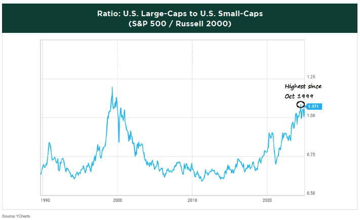Large-cap stocks outperformed small-cap stocks by 13% in 2024, following a 9% outperformance in 2023. This represented the largest two-year outperformance of large-caps over small-caps since 1997-1998. During the year, the ratio of large-caps to small-caps reached its highest level since October 1999.