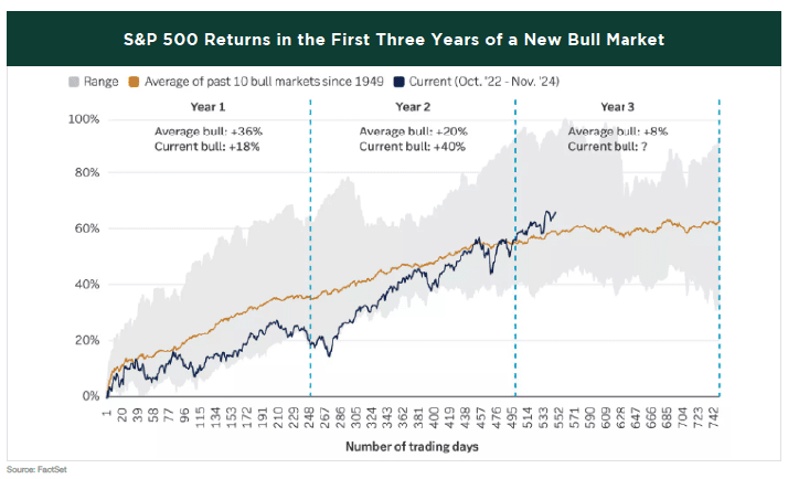 Despite strong fundamentals, the third year of this bull market may not be as smooth as the previous couple of years. There is significant policy uncertainty surrounding trade, immigration, and tariffs, as well as heightened expectations for pro-growth initiatives. While the right mix of policies could boost the economy, it also carries potential implications for inflation and interest rates.