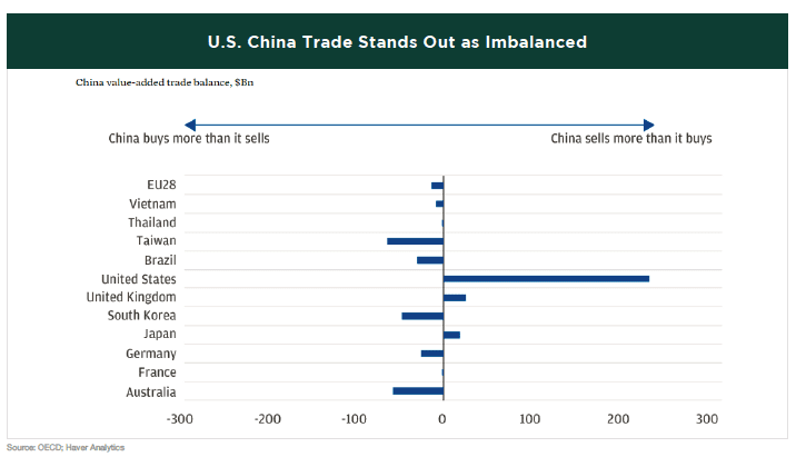Many are concerned about the U.S. entering a trade war with China. If that occurs, China’s economy would likely feel a much greater impact than ours. Looking at China’s trade balance with the world, which measures the net difference between what two countries buy from each other, one clear standout is the United States. The U.S. purchases far more goods from China than it exports to China. Specifically, China’s exports to the U.S. account for about 3%-4% of its GDP, while U.S. exports to China make up only 0.5% of China’s GDP. China’s exports to the U.S. are vital for many of its industries, giving the U.S. significant negotiating leverage with China.